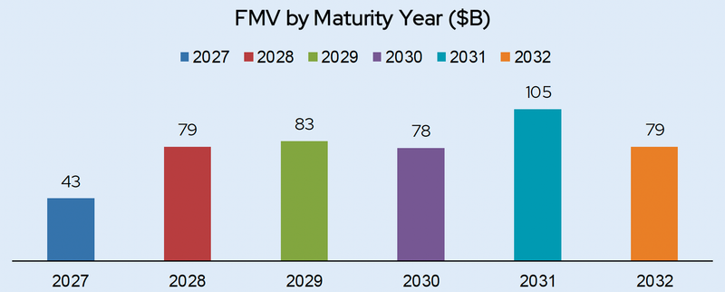 Software positions are heavily concentrated in the 2027 to 2032 maturity window. Over $467 billion in principal across nearly 37,500 positions will need to refinance during that period, with 2031 representing the single largest year.