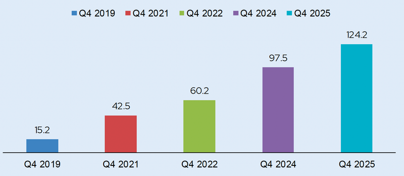 PRISM tracks $124.2 billion in software fair market value across 131 funds and 1,305 companies as of Q4 2025. Six years ago that number was $15.2 billion. The growth has been relentless, an 8x increase that shows no sign of slowing.