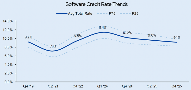 As software exposure has grown, rate dispersion has collapsed. The interquartile range across all software credits now sits at just 160 basis points. For a sector that spans core banking infrastructure to discretionary website builders, that band is remarkably tight. It implies the market is treating structurally different software credits as roughly interchangeable. They are not.
