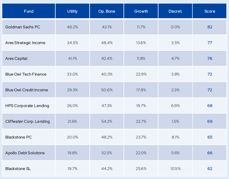 Goldman Sachs Private Credit holds a software book that is 46% Utility Software, the highest concentration among major lenders. Discretionary exposure rounds to zero. At the other end, Blackstone Secured Lending carries just 20% Utility Software, with over a third of its book in Growth Dependent and Discretionary credits. The "secured lending" label masks a software portfolio with meaningful mid market and equity like risk.