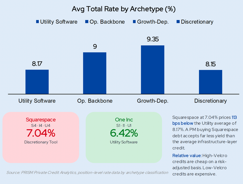 The Squarespace versus One Inc comparison makes the point concrete. Squarespace (S4, I4, U4) is a Discretionary Tool whose customers can cancel monthly. One Inc (S1, I1, U1) is Utility Software embedded in insurance claims infrastructure. Squarespace prices at 7.04%. One Inc prices at 6.42%. Most striking: Squarespace at 7.04% sits 113 basis points below the Utility Software average. A portfolio manager buying Squarespace debt accepts far less yield than the average infrastructure layer credit while taking on a borrower with no structural switching costs.